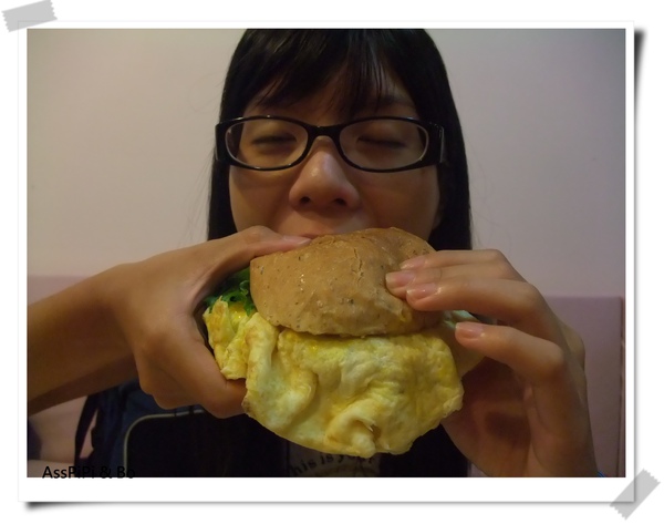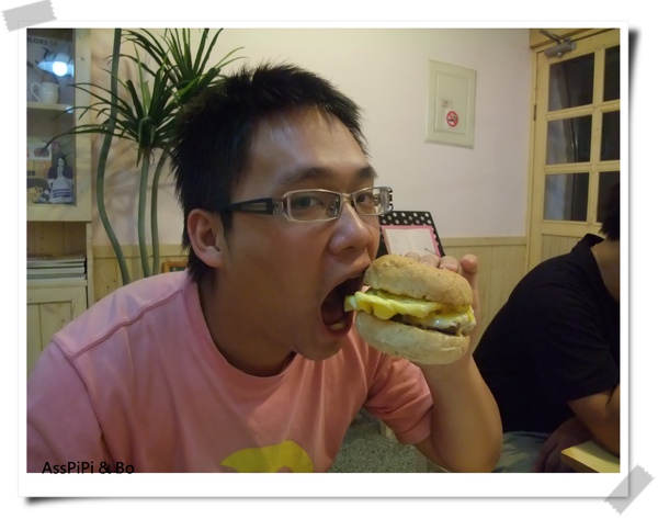 吃漢堡不免俗的要來張大口作勢咬下的痛苦照...